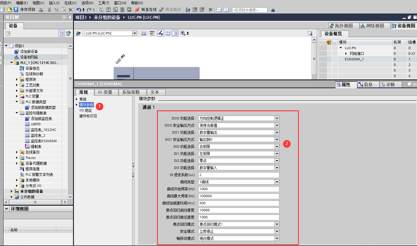 添加ES-04DMA硬件。雙擊后TIA Portal軟件右上角區域會出現LUC-PN擴展模塊的信息。先選中插槽1,再選擇“功能模塊_脈沖”再雙擊ES04DMA。