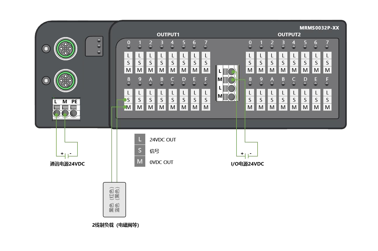 面板式快接線分布式I/O,EtherCAT通訊,2xM12,可級聯;數字量32出 PNP,24VDC,0.5A,歐式彈簧端子;導軌安裝&打孔安裝(下單時需備注)