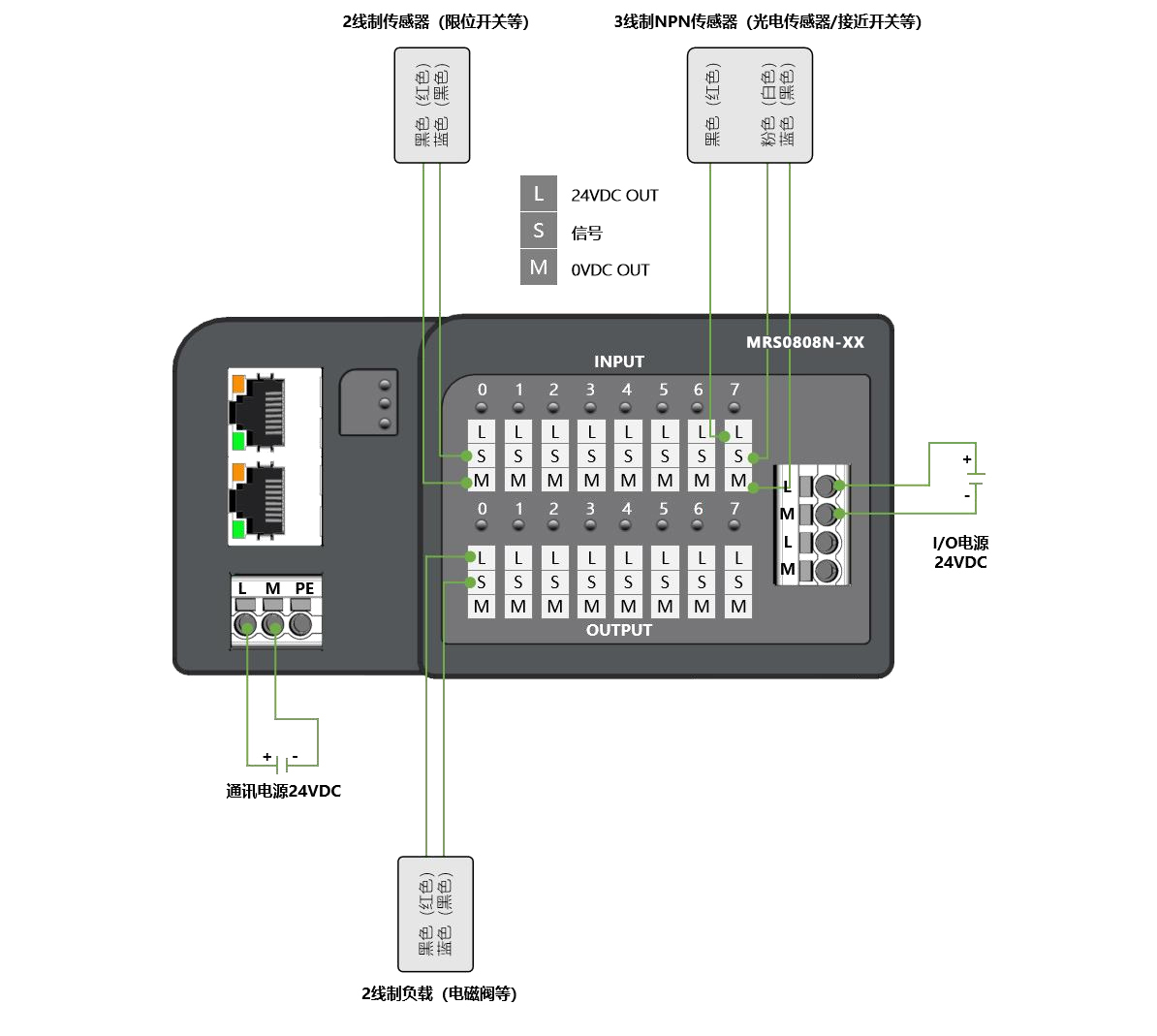 面板式快接線分布式I/O,PROFINET通訊,2xRJ45,可級(jí)聯(lián);數(shù)字量8入8出 NPN,24VDC,0.5A,歐式彈簧端子;導(dǎo)軌安裝&打孔安裝(下單時(shí)需備注)