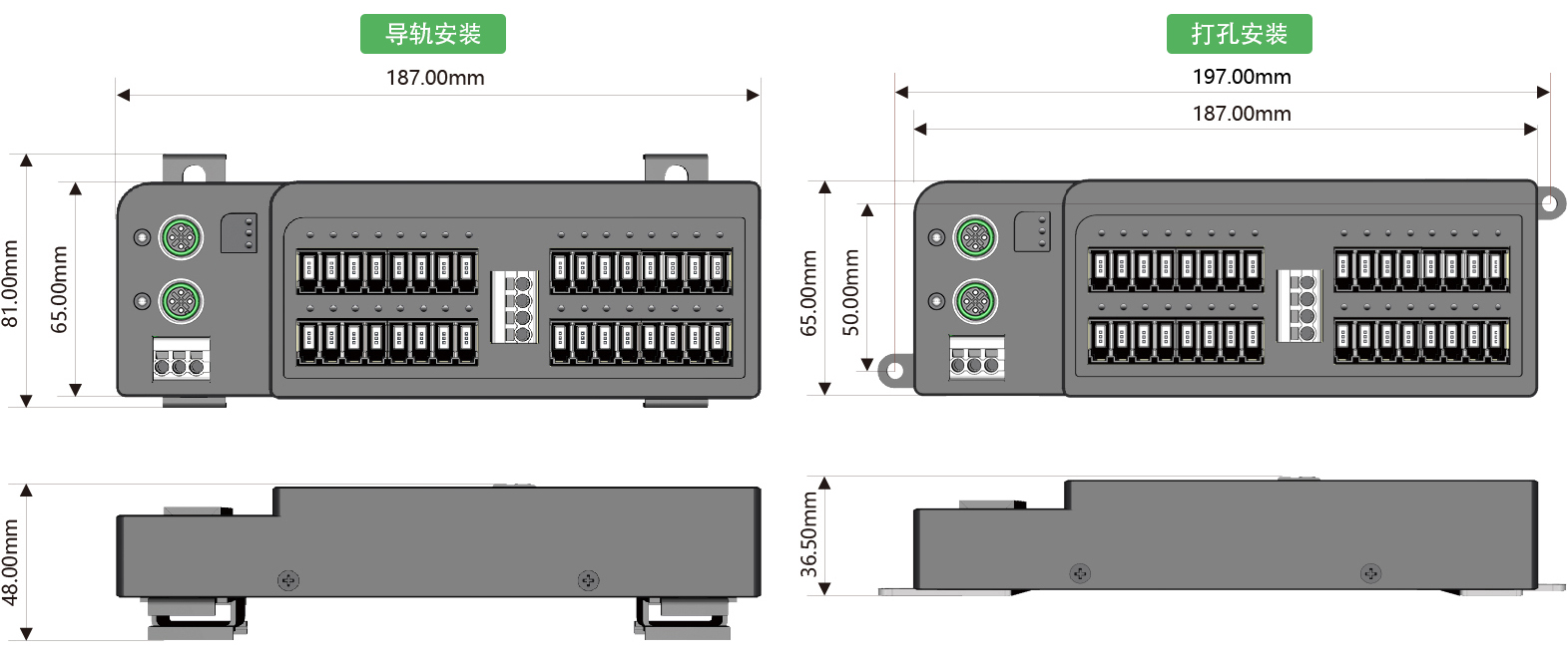 安裝方式:DIN35導軌安裝或雙側耳打孔安裝